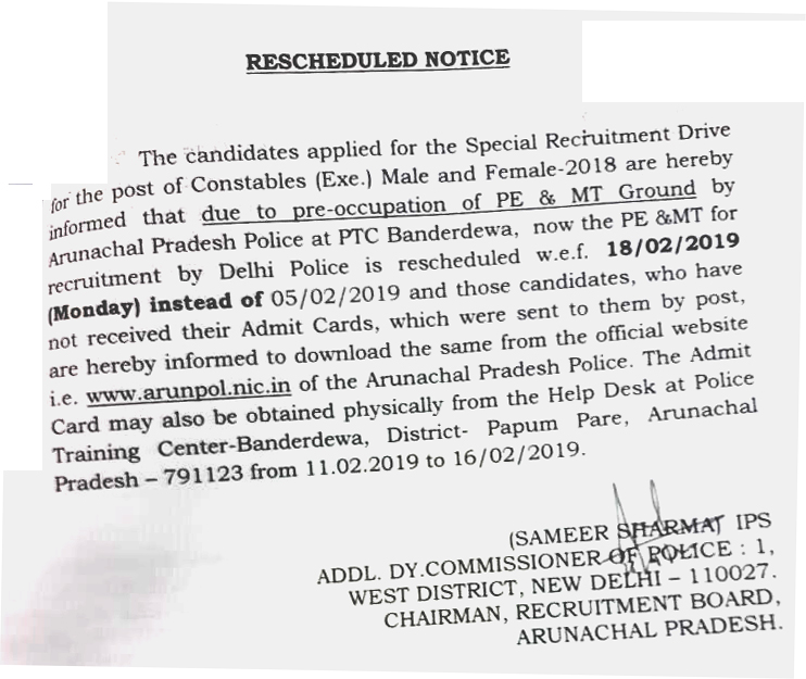 Special Recruitment drive in Delhi Police for the native of Arunachal Pradesh