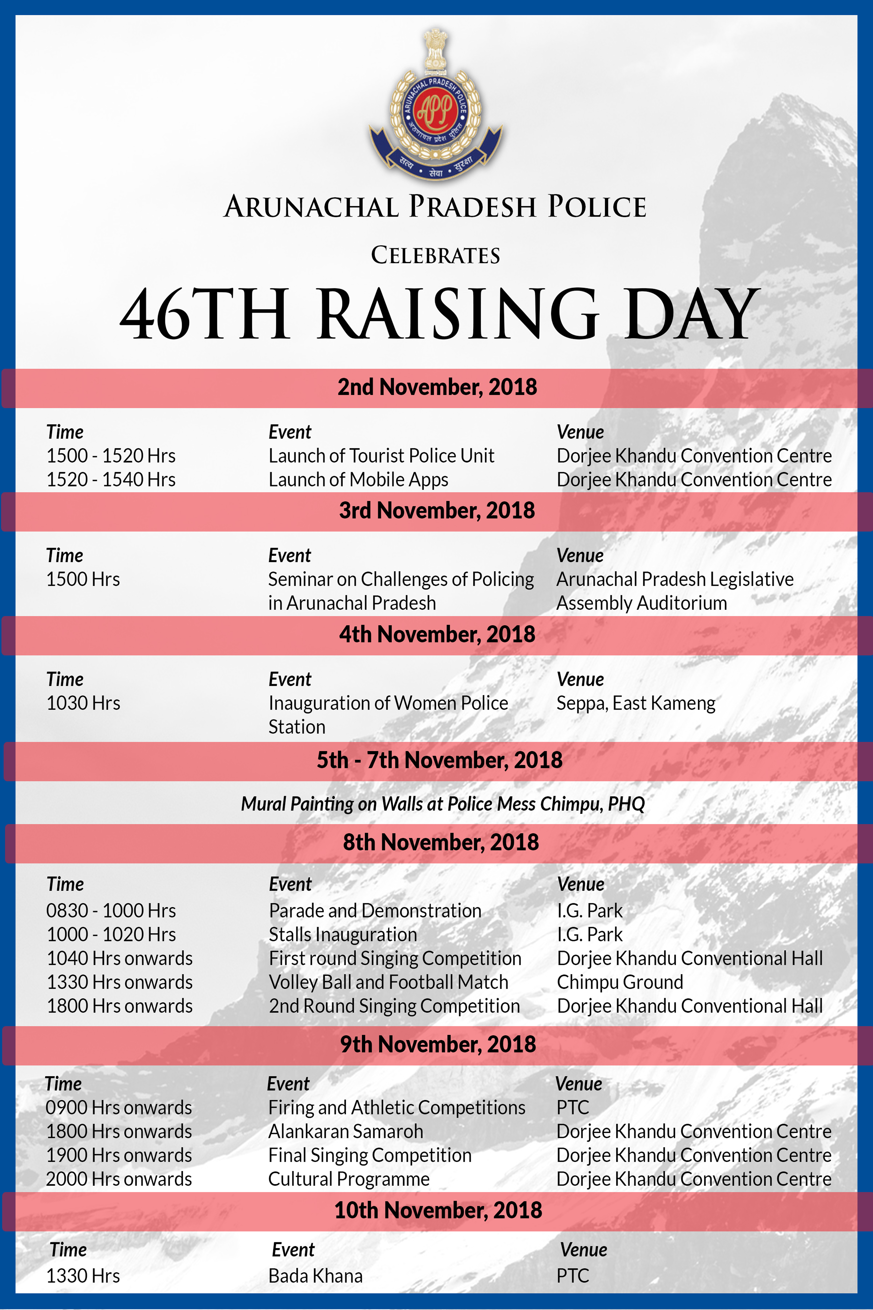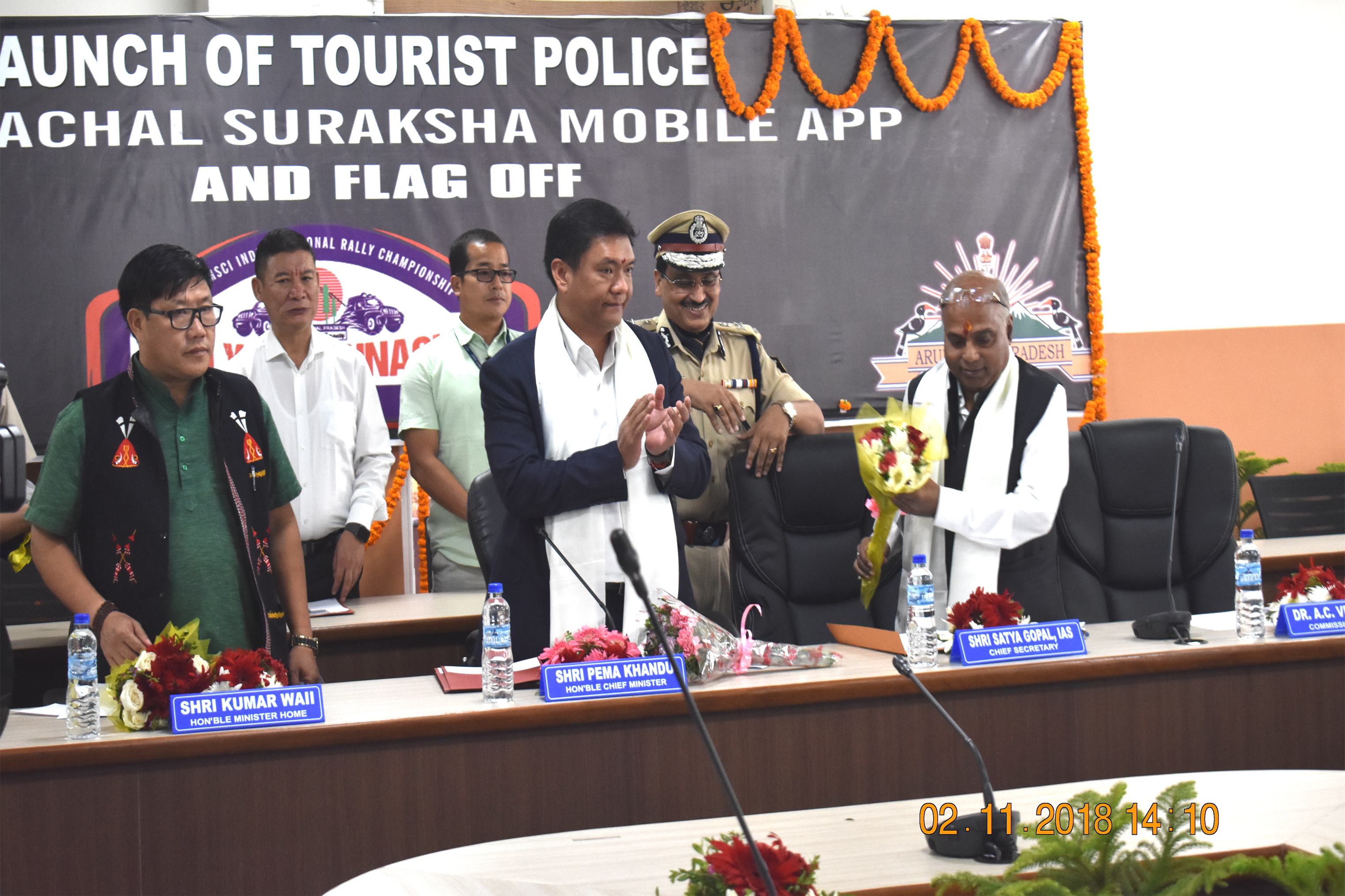 02/11/2018 | Launch of Tourist Police, Arunachal Suraksha Mobile APP and Flag Off by Sri Pema Khandu, Hon'ble Chief Minister of Arunachal Pradesh at Dorjee Khandu State Convention Centre, Itanagar, on 2nd November 2018. |