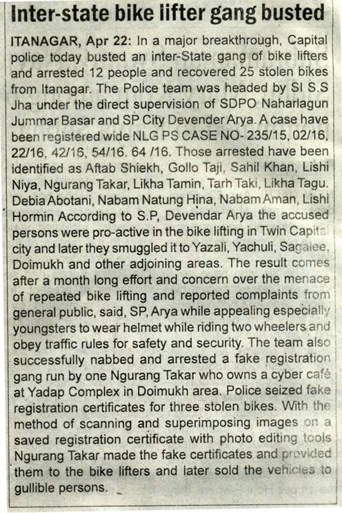 Women PS Case No. 16/16 U/S 365/354/376(1)/511/325 IPC A written FIR was received from Smti. Yare Paw, age-35 yrs W/o Shri Taki Paw of village Kaying, PO/PS – Kaying, District- West Siang Presently residing at P-sector, Itnagar to the effect that on 25/02/2016 her daughter was taken by one of her friend Miss Rumik Tony alias Yani to celebrate Nyokum at Nyokum Lapang, Itanagar and introduced her to her male friends namely Ache Natung and Shaan Sonam and later Shaan Sonam on pretext to drop her home took her to Dariya Hill, Itanagar with ill motive. After reached there Shaan Sonam tore her cloths and forcibly tried to commit sex with her and threatened her with dire consequence to kill her, fortunately she escape and jumped from Dariya hill due to which she sustained several bodily injured. The I/O of the case L/SI N. Angu and her team has arrested the alleged accused Shaan Sonam Waii age- 26 yrs on the next day from Itanagar. |